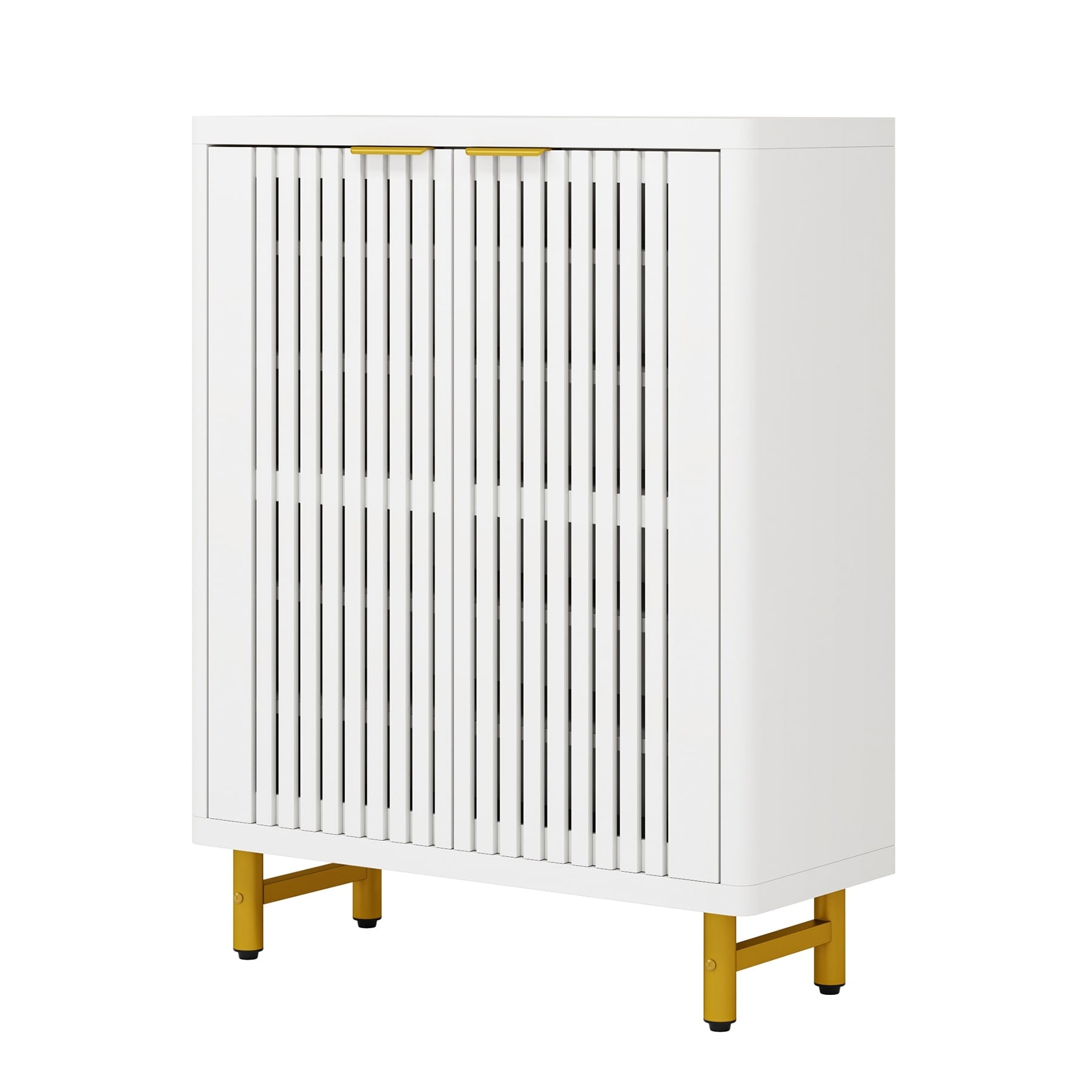 Capture the essence of modern design and convenience with our 2-door shoe cabinet. Its doors are artistically crafted with a striped hollow design that adds to the overall elegance of the cabinet. Hidden behind the doors are five adjustable spacious shelves, making it the perfect storage solution for your footwear collection. Constructed from durable engineered wood and supported by heavy-duty metal legs, this shoe storage cabinet is built to last. The overall dimensions of this cabinet are 13.78'D x 33.46'W x 43.31'H, making it an ideal fit for any space. The package includes foot pads and easy-to-understand assembly instructions for your convenience.