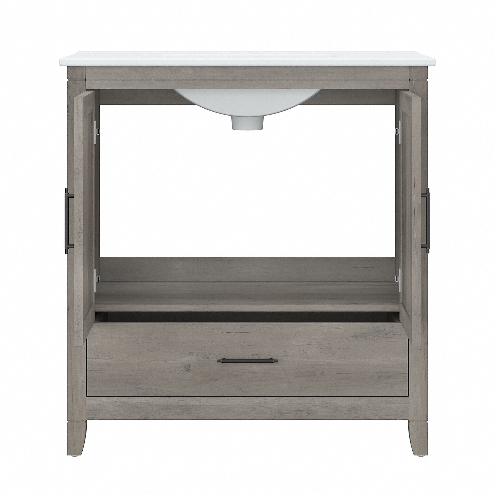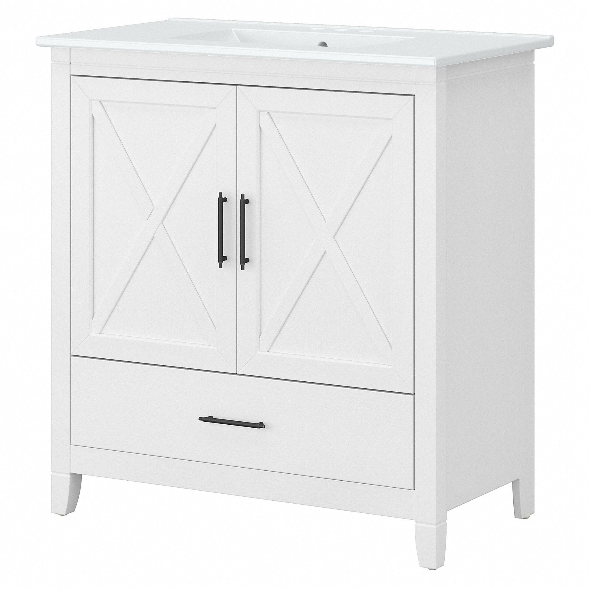 The Bush Furniture Key West 32W Bathroom Vanity with Sink is a perfect way to outfit your home in authentic farmhouse style. Featuring a refreshingly casual design, this wall-mounted vanity combines impressive looks with the durability and convenience needed for years of trouble-free use. The sink has three pre-drilled holes for a 4-inch centerset faucet (fixtures not included) along with an overflow hole and a 1.75-inch drain. The white ceramic basin can be cleaned quickly and easily with nothing more than a soft sponge, water and detergent. Take advantage of a built-in drawer and storage cabinet to keep cleaning supplies, towels, toiletries and other personal care essentials organized and accessible. Cabinet doors include smooth Euro style hinges and unique X pattern accents that look great in your choice of distressed Driftwood Gray and White Ash finish options. Backed by the Bush Furniture 1 Year Manufacturer's Warranty, this small bathroom sink cabinet has been rigorously tested for safety, durability and performance while the Drop-in Sink Basin meets UPC and CSA B45.1 certification standards for ceramic plumbing fixtures. User assembly and installation is required. See the full collection of Key West's farmhouse bathroom furniture to upgrade as needed with a Medicine Cabinet, Wall Cabinet, Over The Toilet Storage Cabinet, Tall Bathroom Storage Cabinet and Laundry Hamper with Lid and Removeable Liner (coordinating items sold separately).