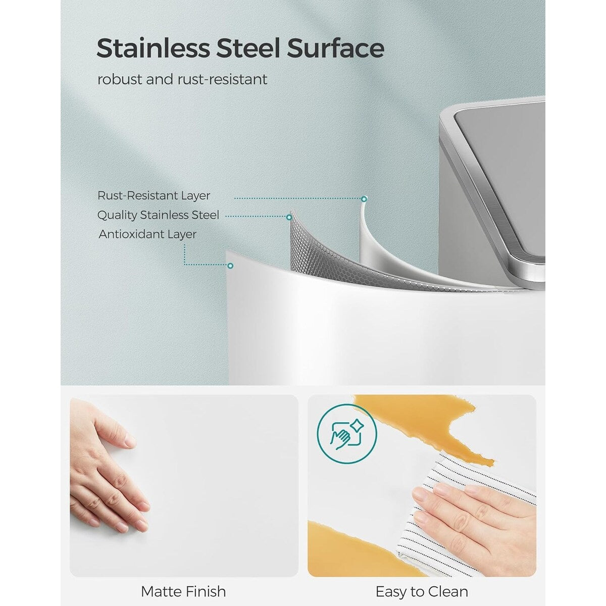 • [Strong yet Soft] The rigid stainless steel body of this garbage can withstands long-lasting use; the soft-close lid ensures the environment remains peaceful, with no loud slamming to be heard