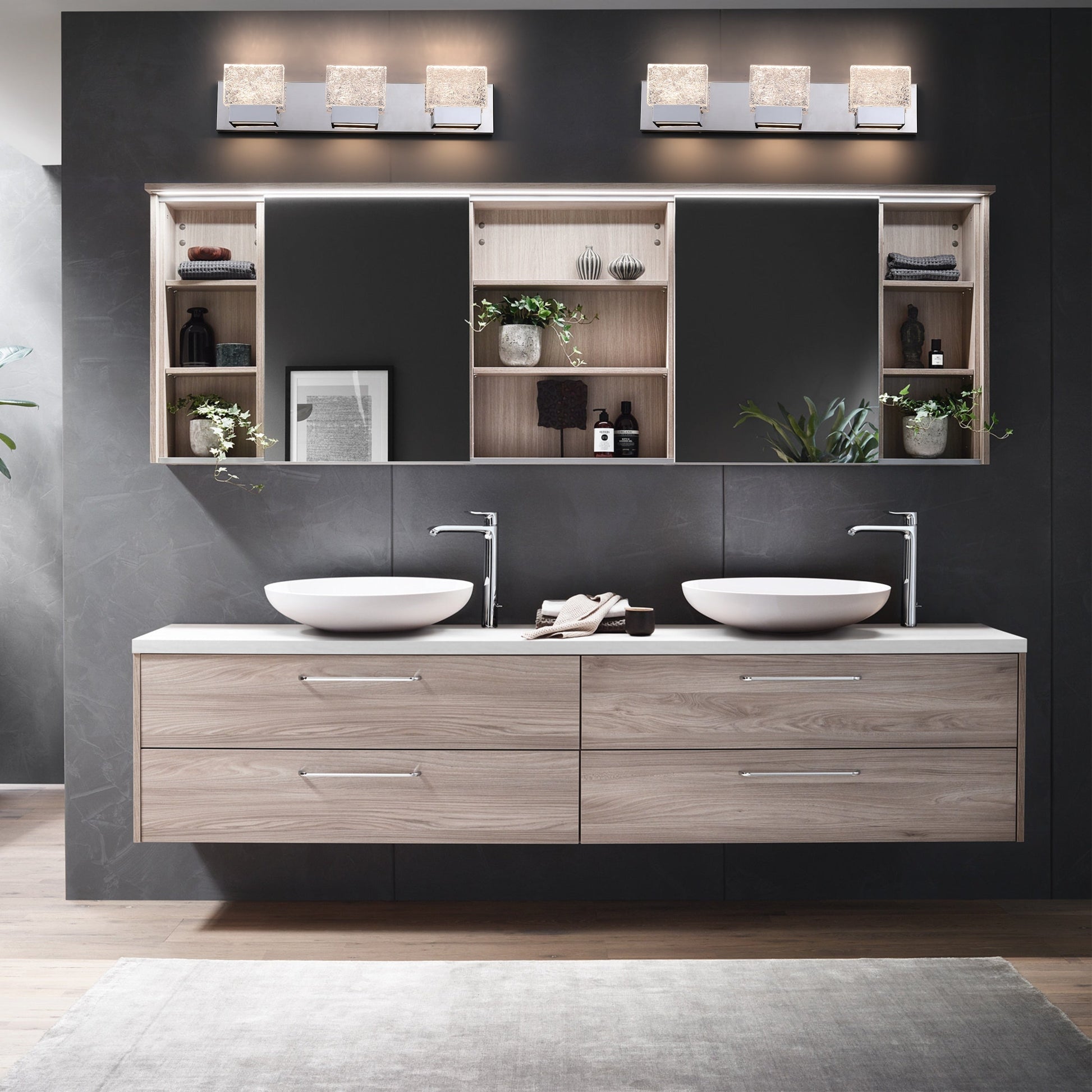 Upgrade your bathroom with the sleek and energy-saving Stainless Steel LED Vanity Light with Art Glass Shades in Chrome. The clear ice-like brick-art glass shades give a contemporary touch that will complement any décor style. Made with durable stainless steel and integrated LED modules in an acrylic diffuser, this maintenance-free fixture is perfect for your bath area.