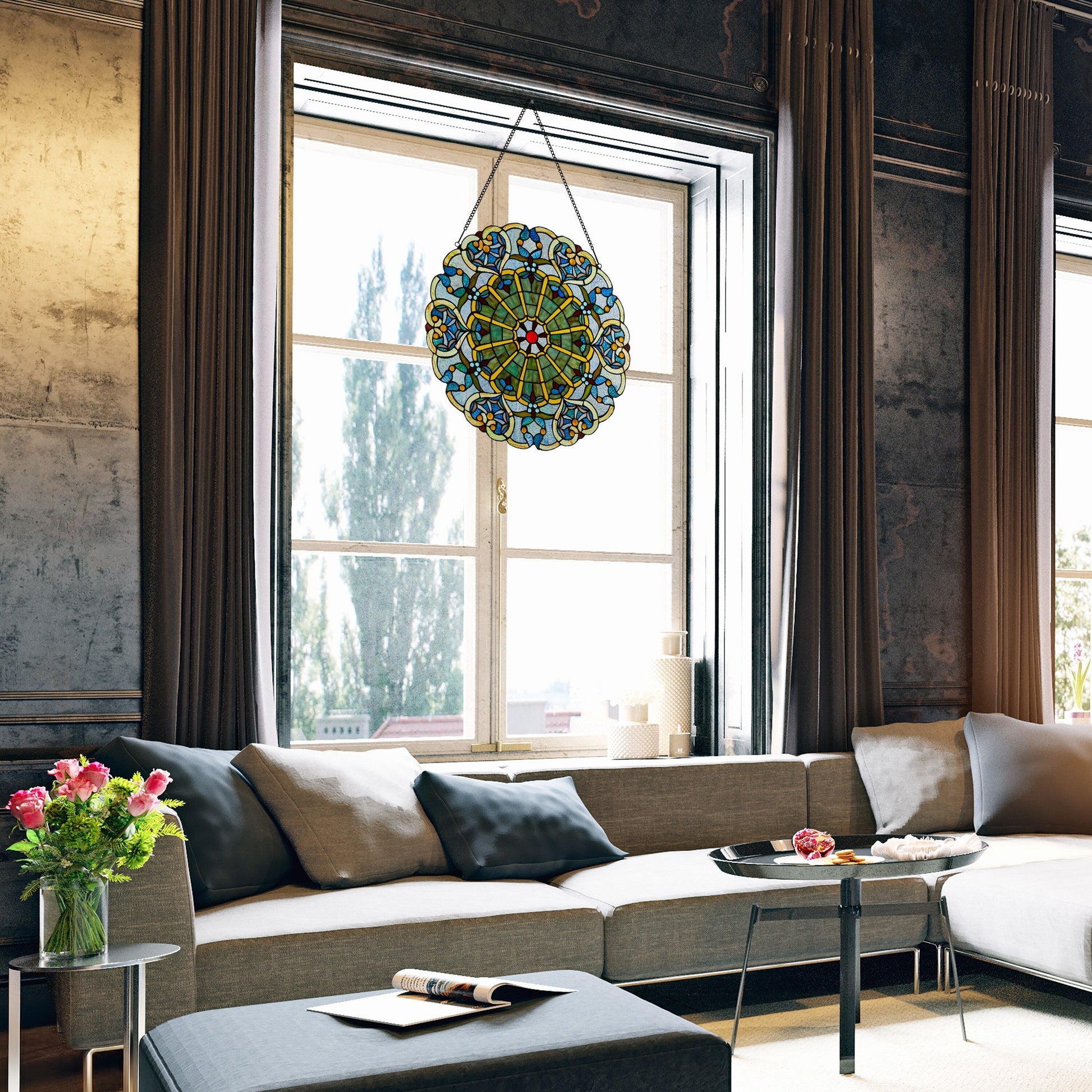 Add a touch of tradition and elegance to any room with this 22-inch Victorian-inspired stained glass window panel. Showcasing a stunning webbed heart design in rich shades of blue, this panel is a real conversation starter. Made from handcrafted stained glass, it captures and reflects the light beautifully, creating an enchanting play of colors when placed in a sunny window. It comes with a 30-inch hanging chain for easy installation. The panel is easy to clean, requiring only a damp cloth or lemon oil polish and a soft, dry cloth to retain its vibrant colors.